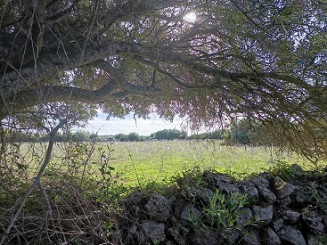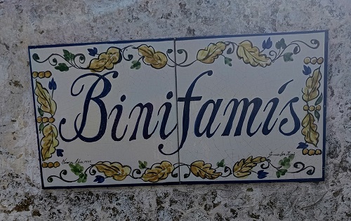 Pasamos a la izquierda al lado de una casa espléndida de nombre Binibolla, con una impresionante palmera erguida como una torre por encima del tejado. Está cerca del principio del camino de Binifamís, marcado con un cartel al bajar por una cuesta empinada de donde se extiende delante un inmenso mar de arbustos de matas como si fuesen espuma verde. A mitad de la cuesta, se ve a la izquierda la finca de Biniarbolla, con invernaderos y muchos árboles repletos de manzanas rojas que brillan con el sol en esta temporada, pendientes de ser recogidas.