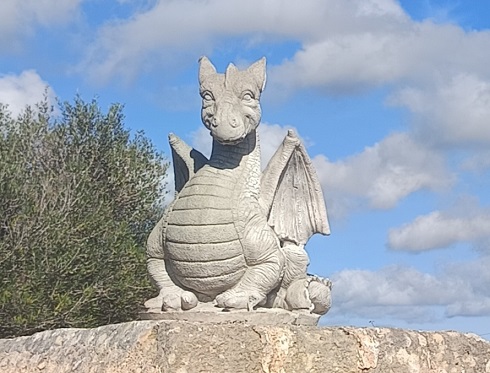 Partint des del col·legi Mestre Duran, passam pel pont sota la carretera general i seguim tot recte, deixam el centre d’ensinistrament de cans a l’esquerra. Arribam a una tanca amb una figuera despullada de les seves fulles, amb un tronc que crida l’atenció perquè s’assembla a un canelobre. Al davant, damunt de la paret, l’altra curiositat és una estàtua d’un drac, col·locada per l’amo de la propietat que va viure molts anys a Gal·les.
