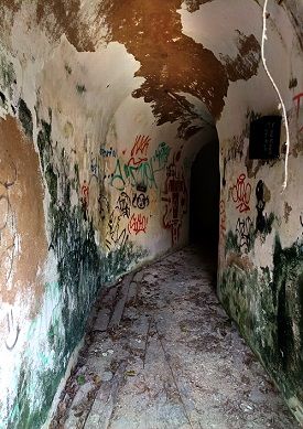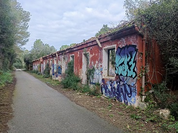 A poca distància apareixen els llargs edificis que són les antigues dependències militars del Polvorí. El conjunt del vell polvorí militar va començar a construir-se durant la Guerra Civil i va finalitzar-se el 1944. Obra avui dels autors de grafiti, està tot en un obvi estat d’abandó. Al davant es veuen les sortides dels túnels en els quals es guardaven la pólvora i les municions, perquè era un lloc segur per les seves voltes i passadissos en forma de laberint per a dissipar l’ona expansiva d’una possible detonació.